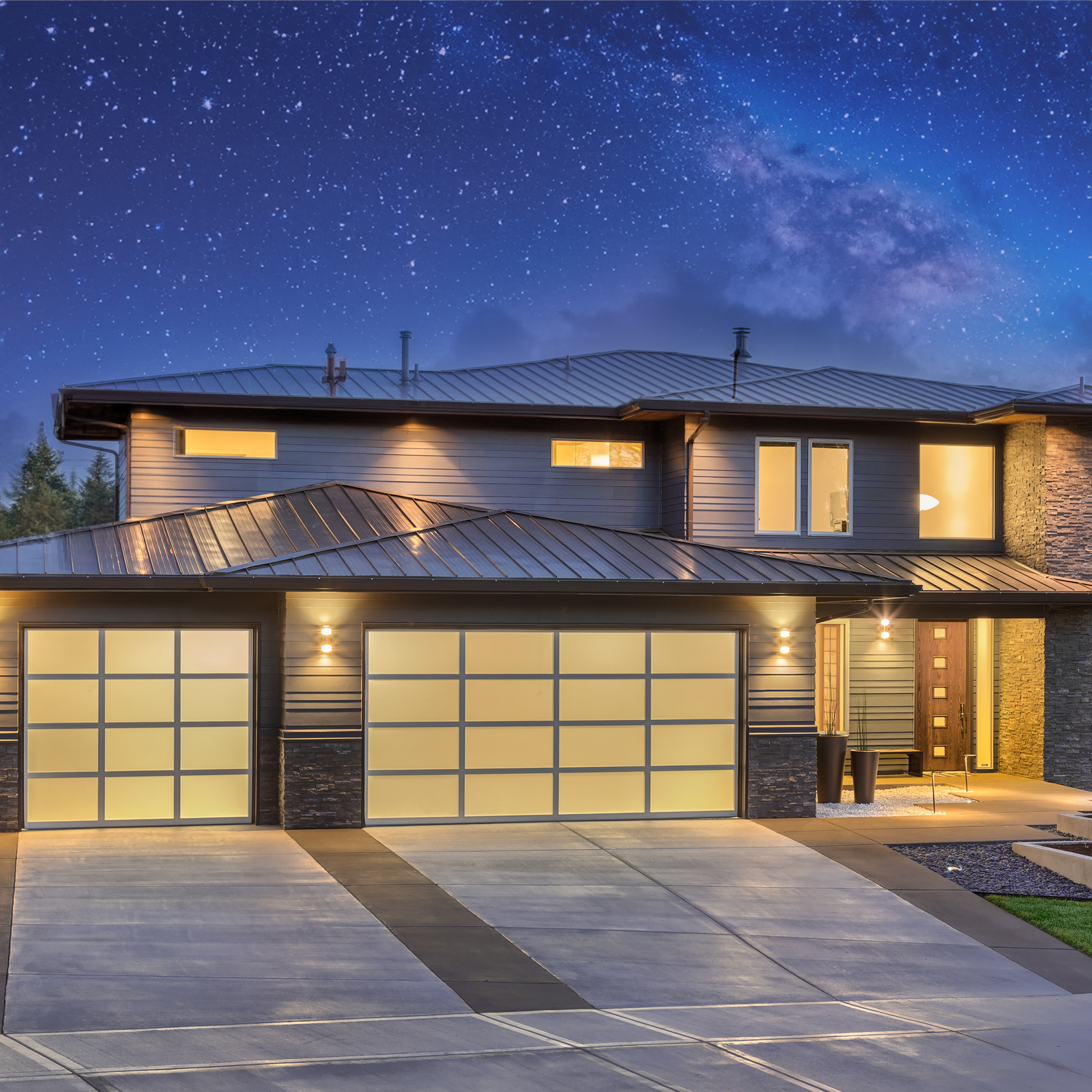 - Front elevation of luxury home in evening